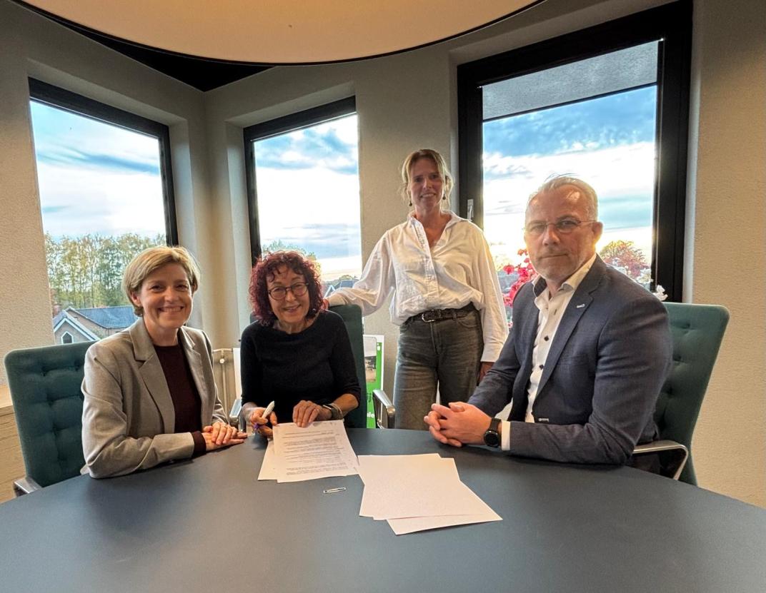 Op de foto van links naar rechts: Marjolein Wenting van Paraat scholen, Ingrid Wolsing, wethouder gemeente Montferland, Sandra Scholten van stichting Kinderopvang Puck & Co en Bart van der Ent van PRO8. Bibliotheek Montferland stemde per mail in met de intentieverklaring.